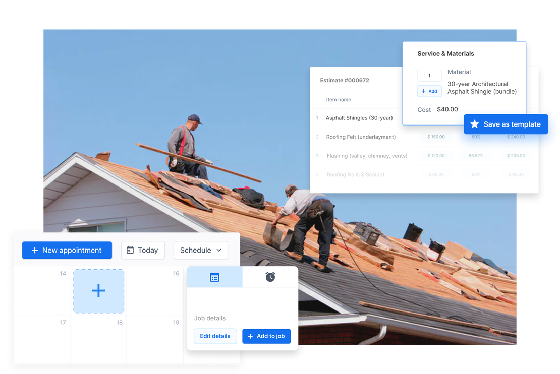 Schedule roofing crews based on job type and location, so tear-offs and installs stay on track.